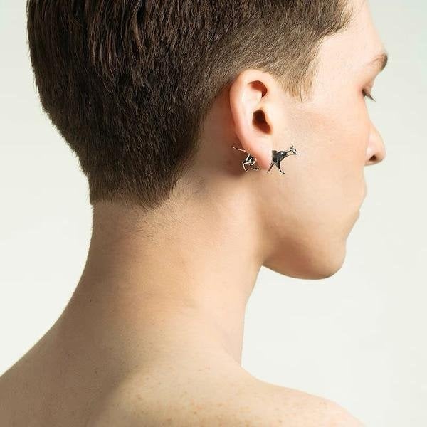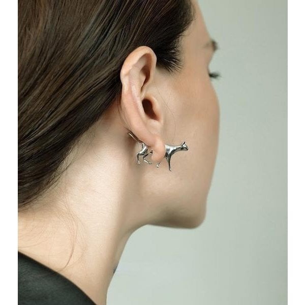 Deze uitzonderlijke oorsteker heeft twee verschillende stijlen: een fijn gedetailleerde jagerpuppy en een kitten. Het hoofdgedeelte van de oorsteker is ontworpen om aan de voorkant te worden gedragen, terwijl het lichaamsgedeelte elegant de achterkant siert. Deze oorsteker is gemaakt van messing op verzilverd en zorgt voor een stevige, opvallende look en uitzonderlijke duurzaamheid. Of je nu een hondenliefhebber, een kattenliefhebber of gewoon iemand die unieke sieraden waardeert, onze zilveren dubbelzijdige oorknop is een must-have accessoire!